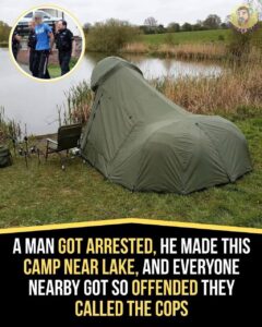 At first glance, the scene looks peaceful. A still lake reflects the cloudy sky. Reeds sway gently at the water’s edge. A green, low-profile shelter sits neatly on the grass, facing the water, with fishing rods set up beside it. It looks like the perfect spot for a calm day of fishing—quiet, remote, and undisturbed.