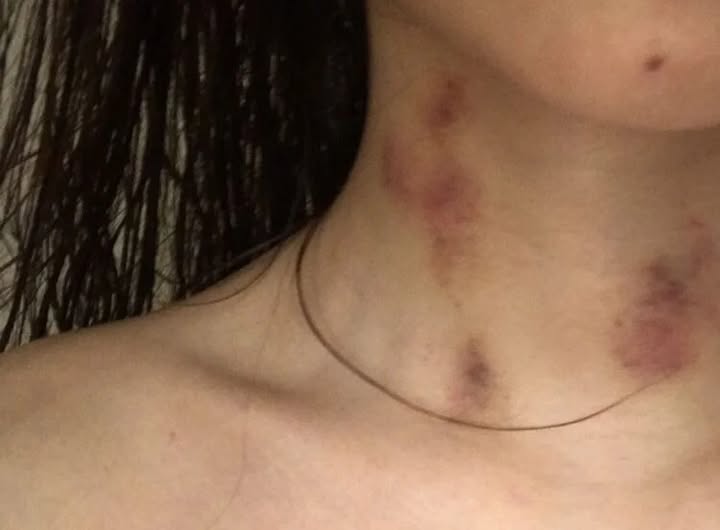 The person in the top image has an excessive number of reddish-purple bruises (likely hickeys) on their neck, chest, and shoulders. While hickeys are usually harmless, this extreme number of marks could indicate: